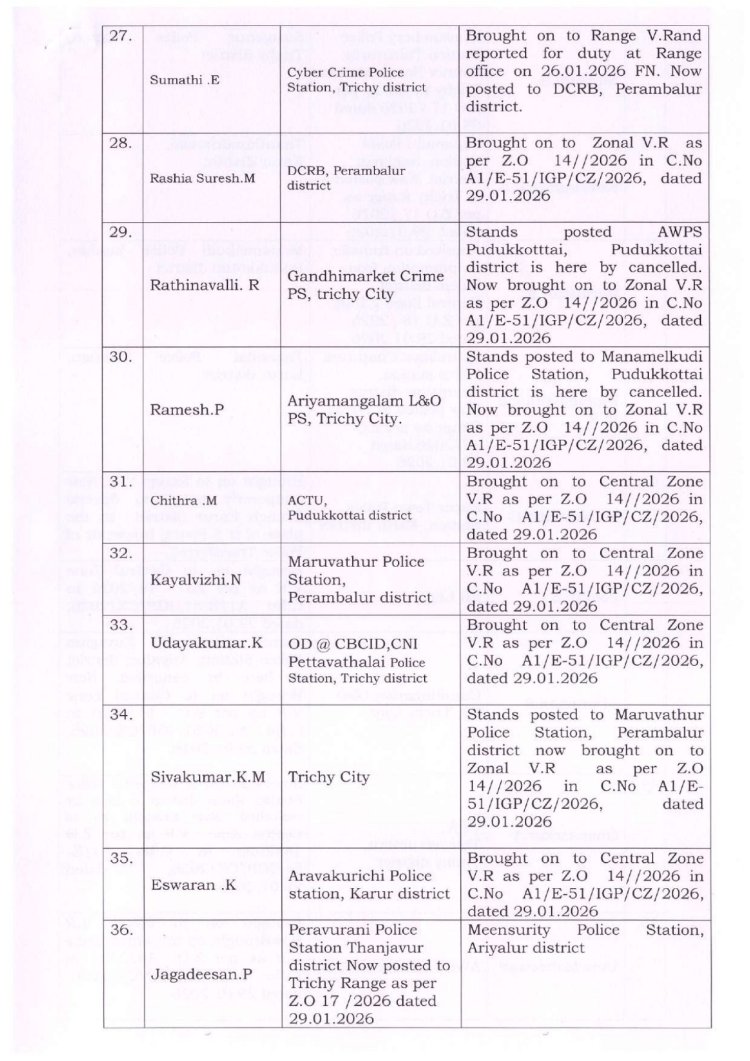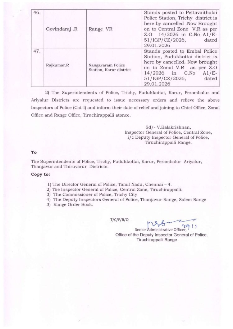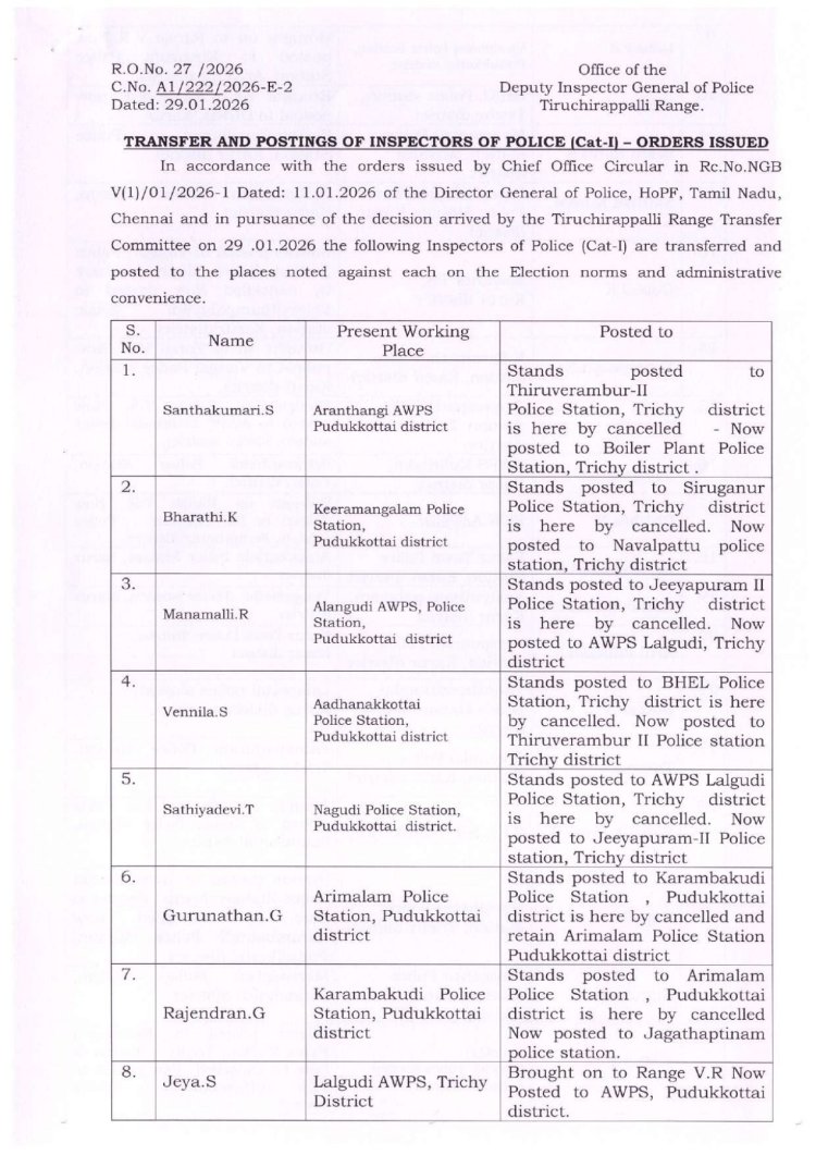 திருச்சி, பெரம்பலூர், அரியலூர், தஞ்சாவூர், புதுக்கோட்டை, கரூர், திருவாரூர் காவல் ஆய்வாளர்கள் பணியிட மாற்றம்