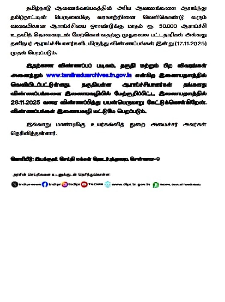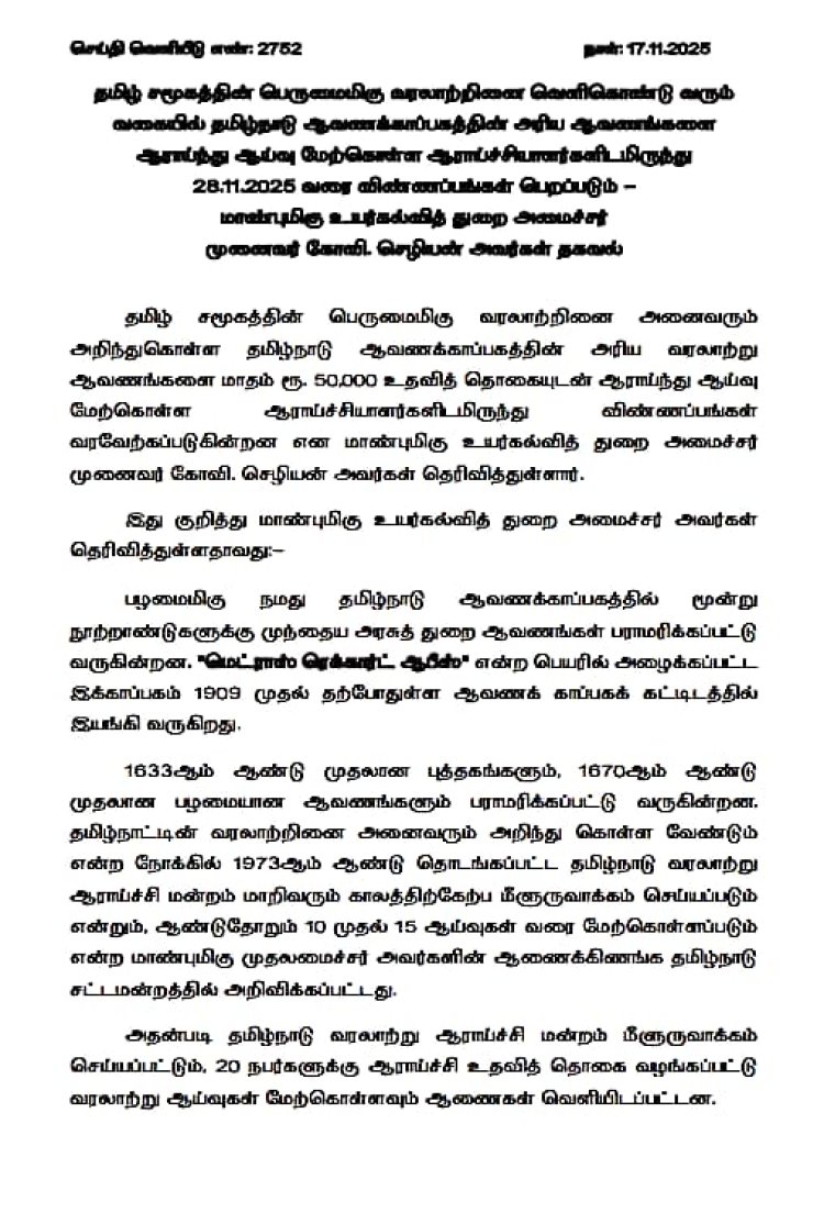 தமிழ் சமூகத்தின் பெருமைமிகு வரலாற்றினை வெளிகொண்டு வரும் வகையில் தமிழ்நாடு ஆவணக்காப்பகத்தின் அரிய ஆவணங்களை ஆராய்ந்து ஆய்வு மேற்கொள்ள ஆராய்ச்சியாளர்களிடம் இருந்து 28.11.2025 வரை விண்ணப்பங்கள் பெறப்படும் - உயர்கல்வித் துறை அமைச்சர் கோவி.செழியன்.