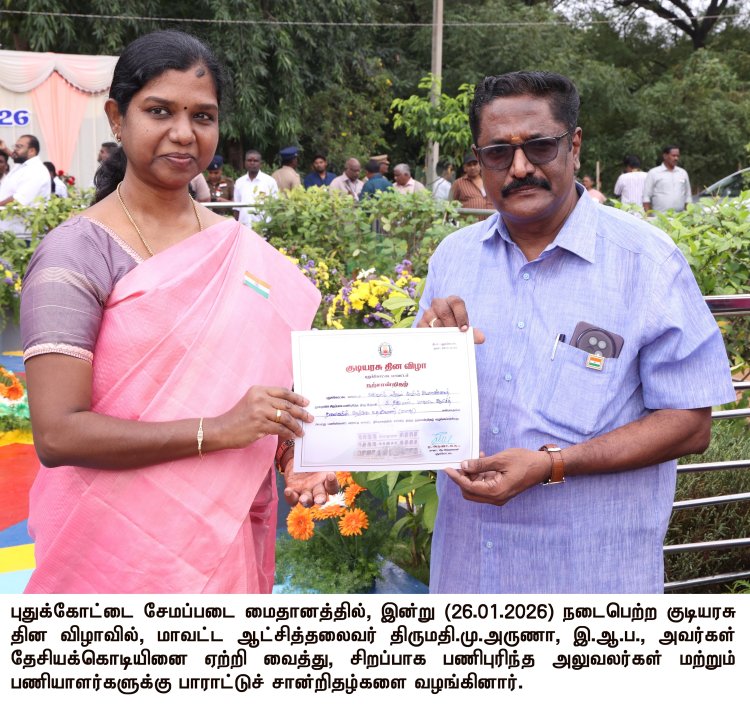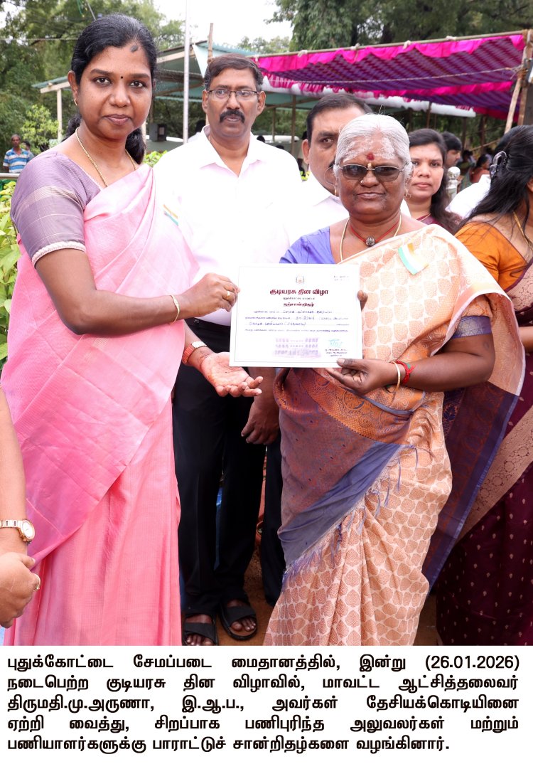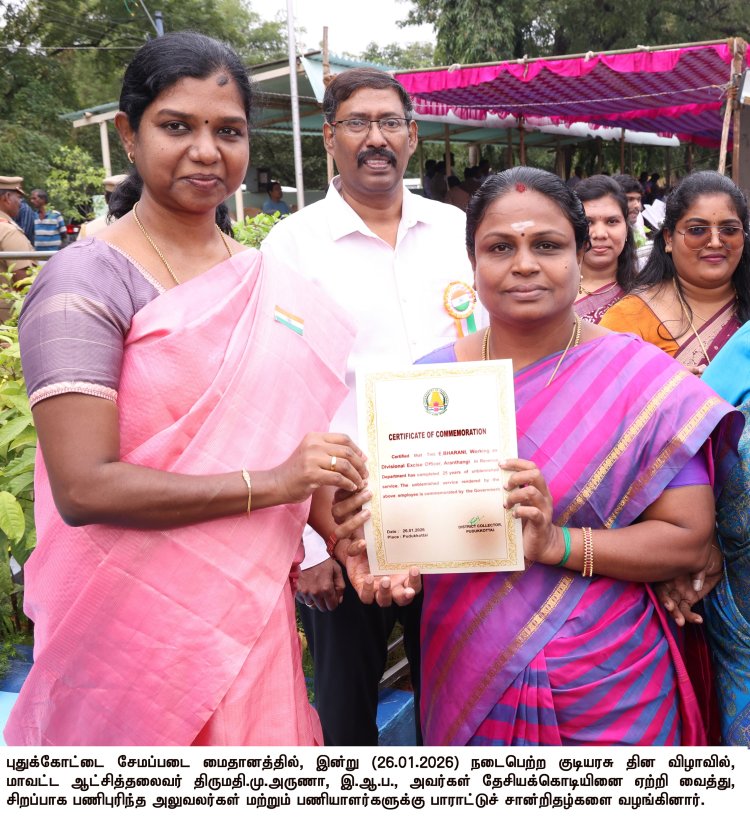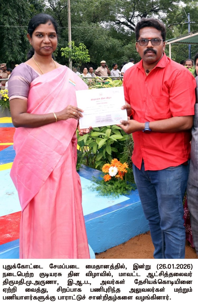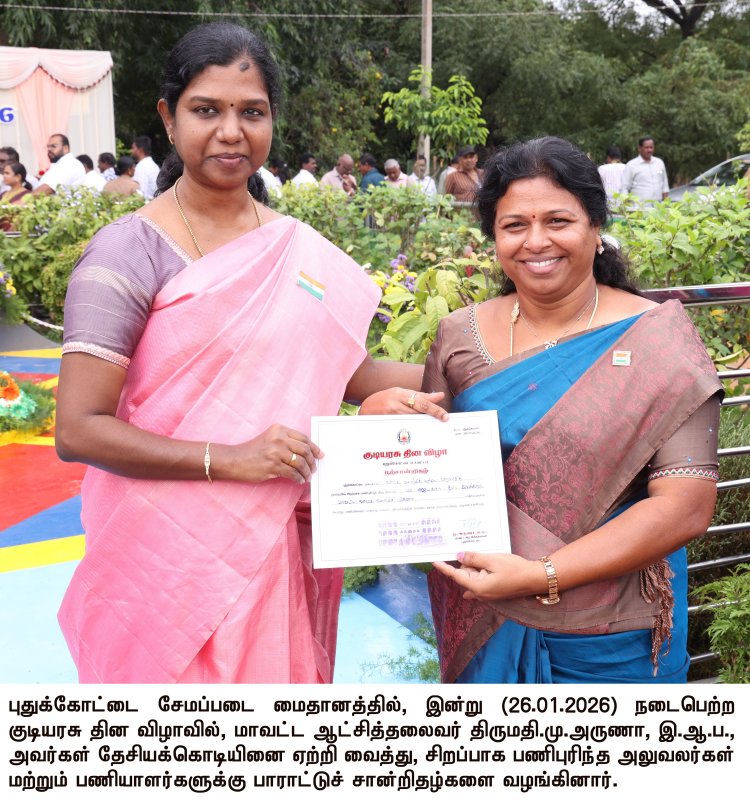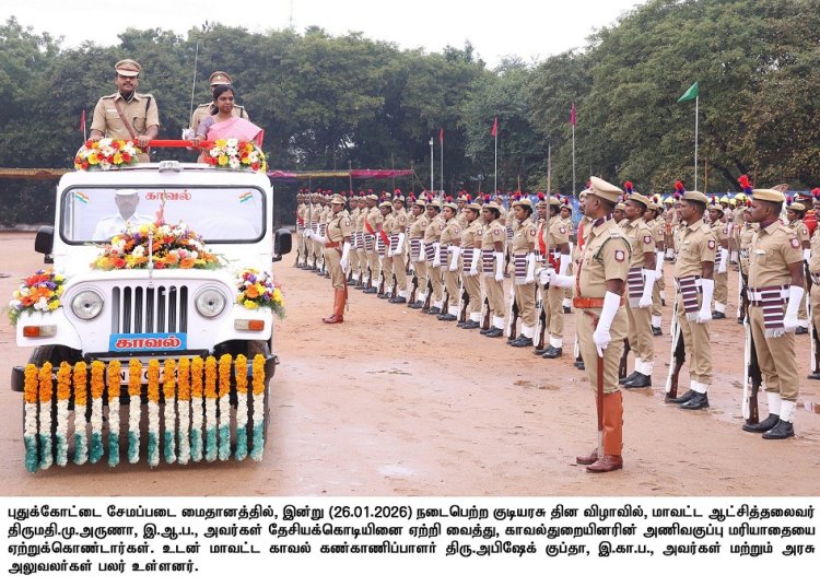 புதுக்கோட்டை சேமப்படை மைதானத்தில் இன்று (26.01.2026) நடைபெற்ற குடியரசு தின விழாவில், மாவட்ட ஆட்சித்தலைவர் திருமதி.மு.அருணா, இ.ஆ.ப., அவர்கள் தேசியக்கொடியை ஏற்றி வைத்து, மரியாதை செலுத்தினார்.