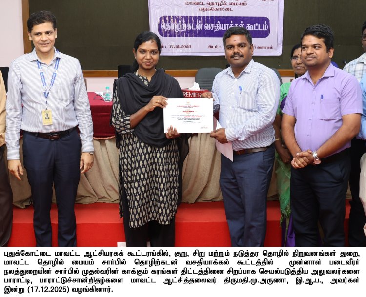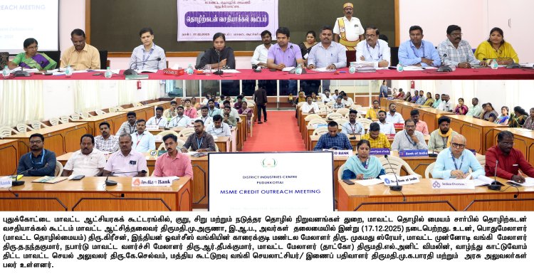 புதுக்கோட்டை மாவட்ட ஆட்சியரகக் கூட்டரங்கில், குறு, சிறு மற்றும் நடுத்தர தொழில் நிறுவனங்கள் துறை, மாவட்ட தொழில் மையம் சார்பில் தொழிற்கடன் வசதியாக்கல் கூட்டம் மாவட்ட ஆட்சித்தலைவர் திருமதி.மு.அருணா, இ.ஆ.ப., அவர்கள் தலைமையில் இன்று (17.12.2025) நடைபெற்றது.