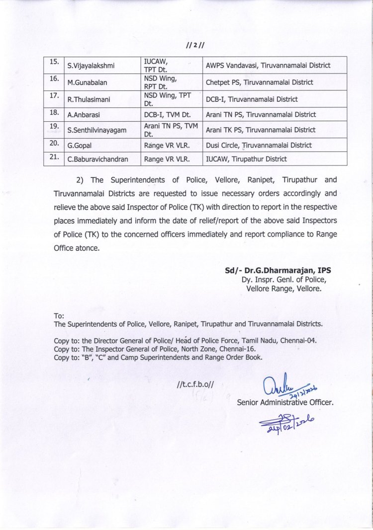 வேலூர் சரகத்தில் 21 இன்ஸ்பெக்டர்கள் பணியிட மாற்றம்